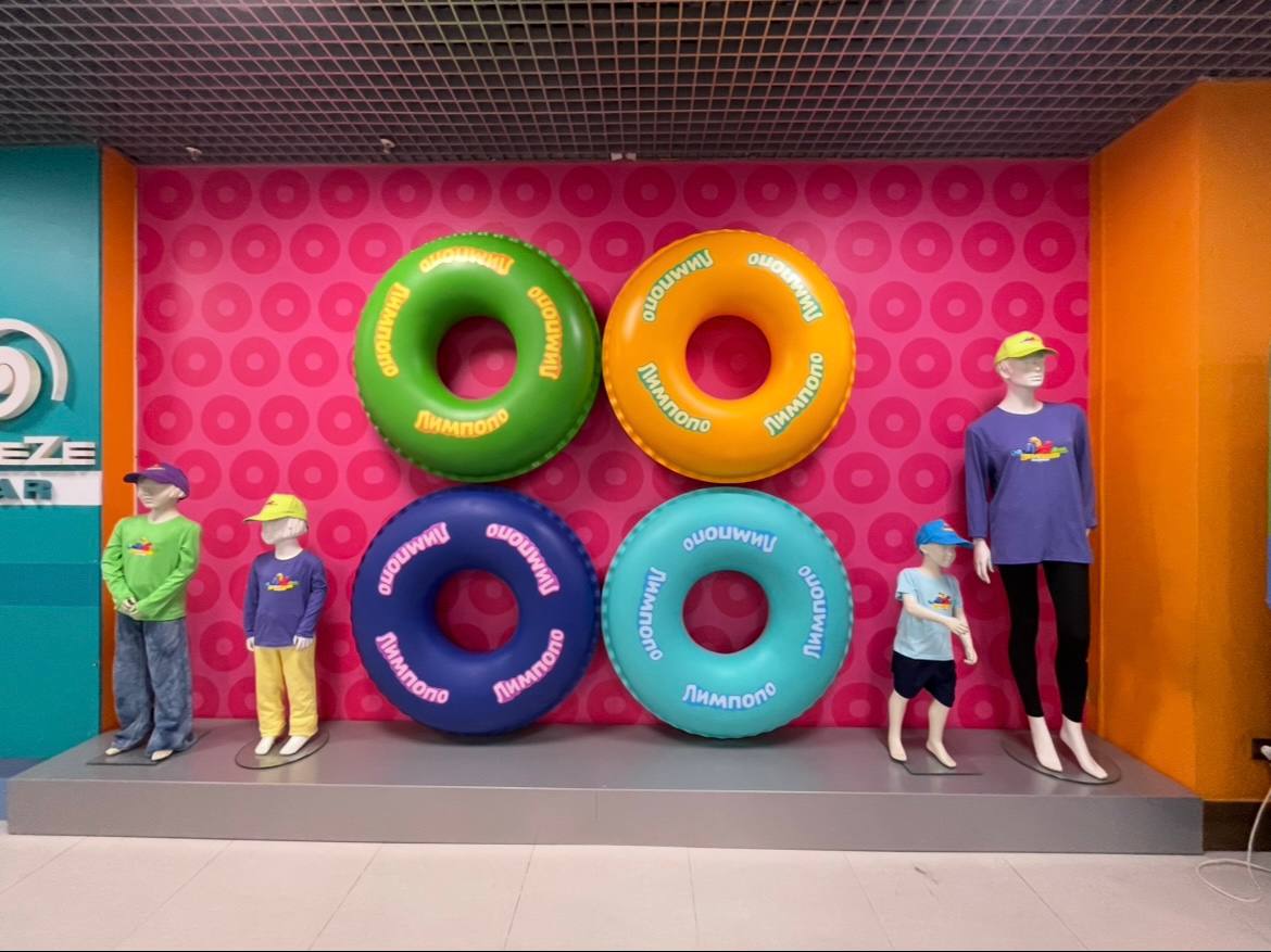 Следующий уровень. К баннеру добавляются трёхмерные объекты: ростовые фигуры, бутафория, объёмные буквы, конструкции. Фотозона становится не фоном, а пространством, в которое можно войти.